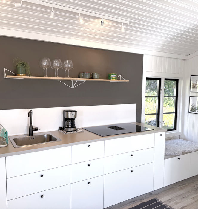 Kombinerat allrum/kök utrustat för självhushåll komplett med porslin och husgeråd. Fullstor kyl/frys, micro, kokplattor och kaffebryggare.